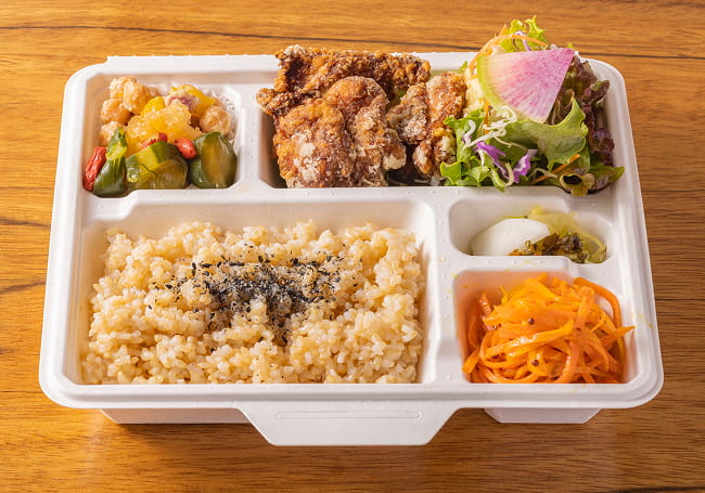 そうざい3品、薬膳醤油麹に漬け込んだ鶏ももの唐揚、玄米ご飯、自家製漬物の入ったお弁当。丁寧に作られたかふぅの味を家庭でもお召し上がり下さい。